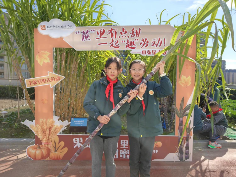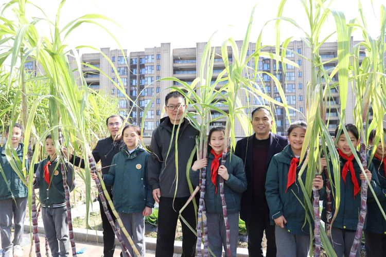 “本草园”是笕弘实验学校依托楼顶空间打造的特色劳动教育基地,自学校成立以来,便成为师生共同耕耘的“空中田园”。从翻土、播种到浇水、施肥,五年级的同学们以班级为单位,定期轮值照料这片“责任田”。此次丰收的甘蔗,正是同学们亲手栽种的成果——当时他们小心翼翼地将蔗苗埋进土里,如今看着一人多高、叶片翠绿的甘蔗林,眼中满是期待与自豪。