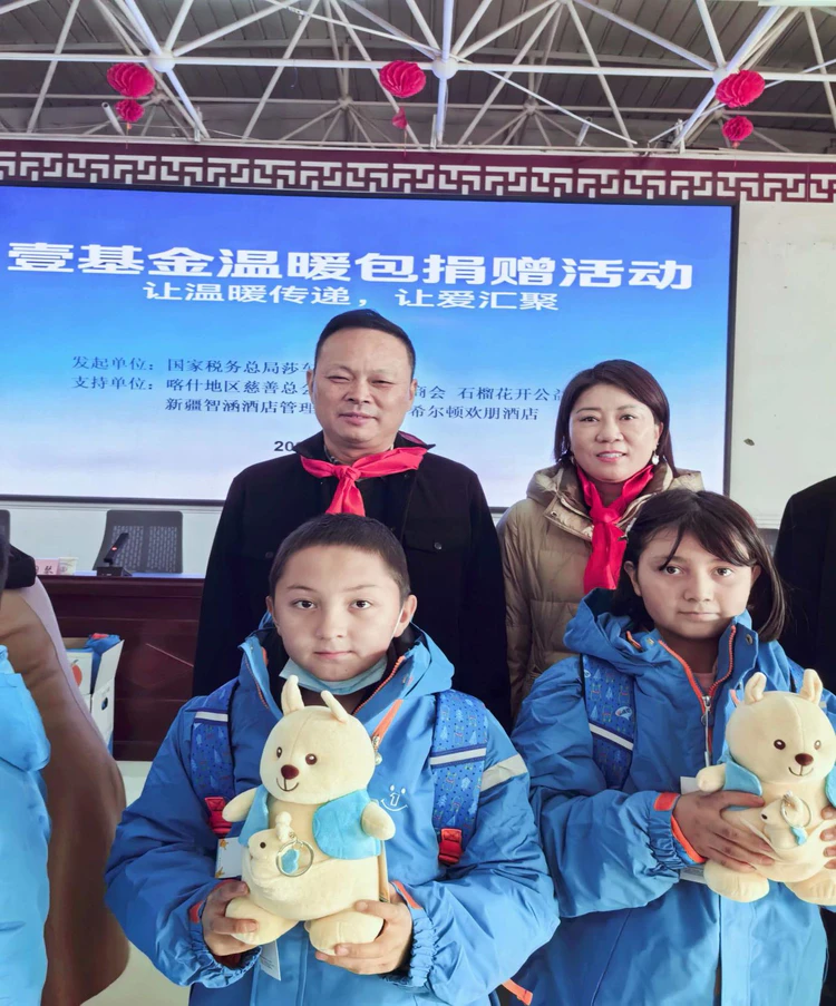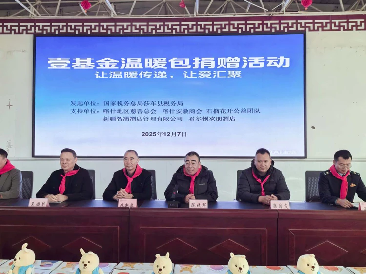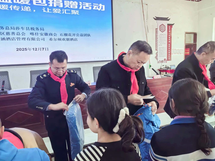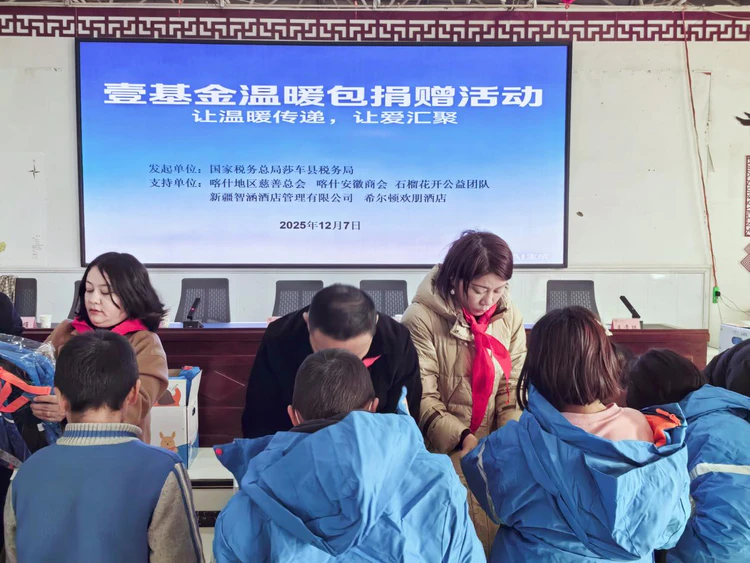 新疆讯【陈会林报道】 寒风裹着寒意掠过南疆大地,12月7日的莎车县艾力西湖镇亚喀塔木(15)村会议室却暖意融融。喀什地区慈善总会、喀什安徽商会、国家税务总局莎车县税务局、喀什石榴花开公益联合会携手新疆智涵酒店管理有限公司、希尔顿欢朋酒店,在这里隆重举行公益捐赠仪式,80名乡村孩子收到了装满冬衣、书包、玩具的壹基金温暖包,让这个冬天充满爱的温度。