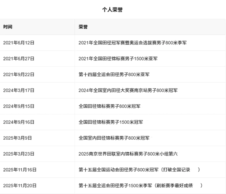2025年11月16日,以1分45秒48的成绩获得第十五届全国运动会田径男子800米冠军,并打破全国记录。11月20日,获第十五届全运会田径男子1500米季军,并刷新赛季最好成绩。