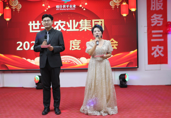 年会舞台上,两位主持人堪称全场“颜值与实力担当”。男主持俊朗挺拔,谈吐间尽显干练沉稳;女主持温婉端庄,笑容里满是亲和大方。两人默契配合,时而用风趣幽默的串词点燃现场气氛,时而用深情款款的讲述传递企业温度,一举手一投足,都完美诠释着世平农业昂扬向上、真诚热忱的企业形象。
