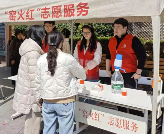 “您好,御窑博物馆往这边走,直行200米右转。”“这里有免费热水,可以休息一下。”在御窑厂景区入口,身穿红马甲的志愿者耐心地为游客提供指引。窑火红志愿服务点配备了免费的导游图、应急药箱、充电宝等便民物资,为有需要的游客提供及时帮助。